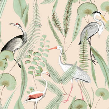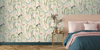 Non-woven wallpaper with flamingos and herons on a light pink finely textured background.