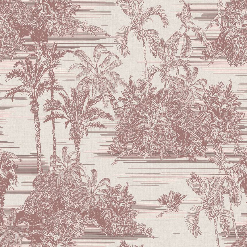 Non-woven wallpaper with brown outlines of palm trees on beige textured background.