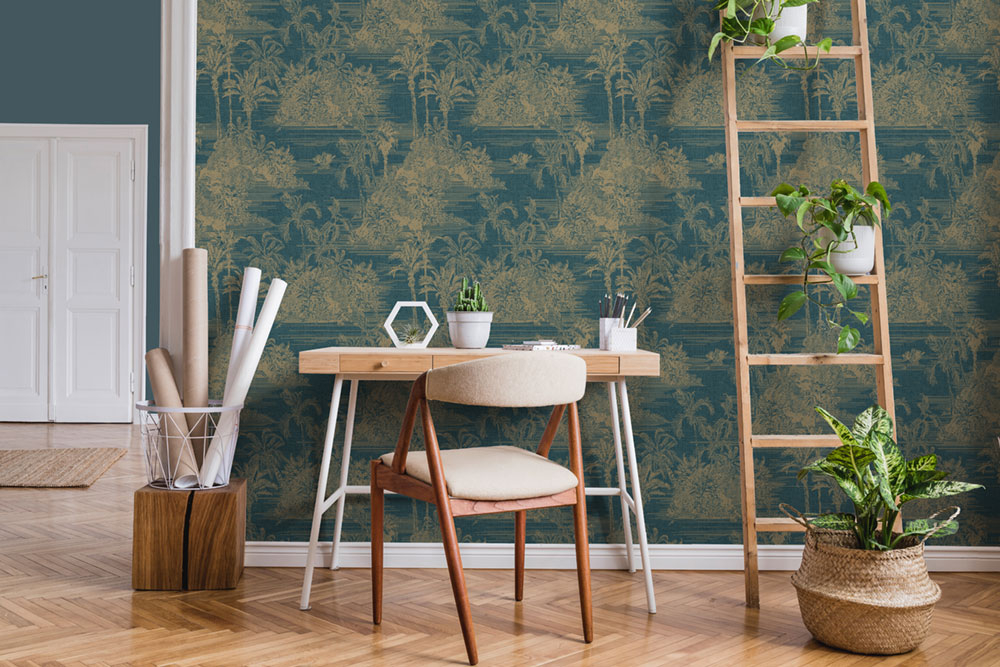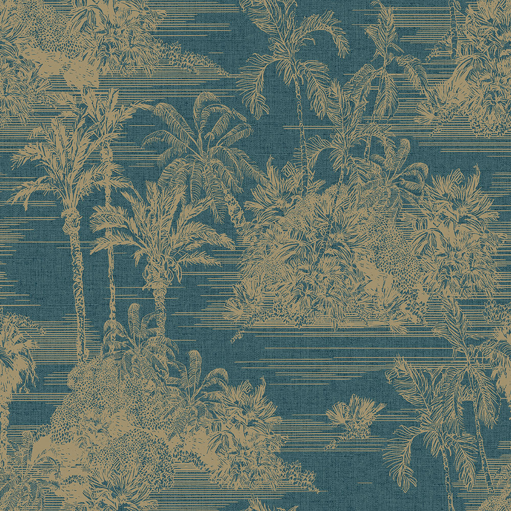 Non-woven wallpaper with golden outlines of palm trees on a dark blue textured background.