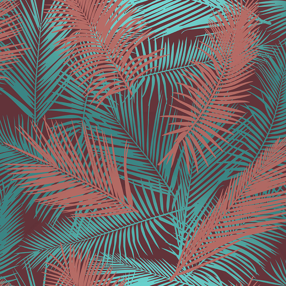 Non-woven wallpaper with burgundy, turquoise and metallic palm leaves on a textured background.