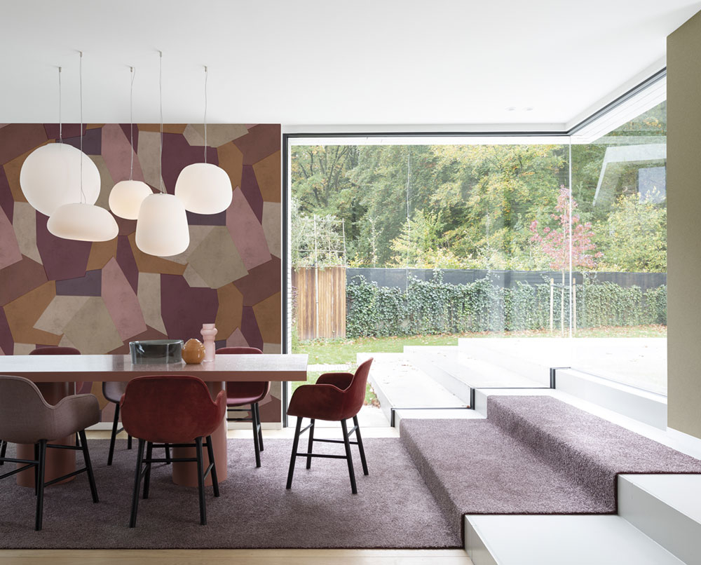 Abstract geometric wall mural with burgundy, pink, brown and beige patterns.