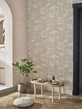Non-woven wallpaper with a vinyl surface in beige shades with a tree pattern.