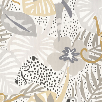 Gray-beige children's non-woven wallpaper - leaves, monkeys and parrots. The wallpaper has a fabric texture.