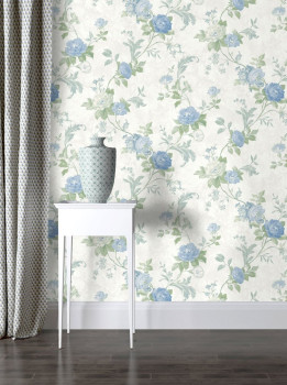 Non-woven wallpaper with a vinyl surface in shades of gray and blue with a floral pattern.