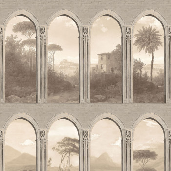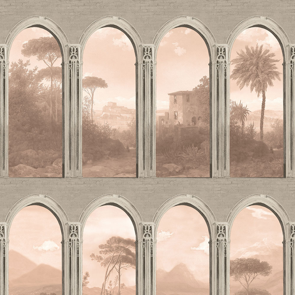 Non-woven wallpaper with a vinyl surface in shades of gray and pink with subtle reflections - arcade pattern with a landscape.