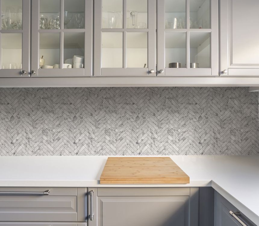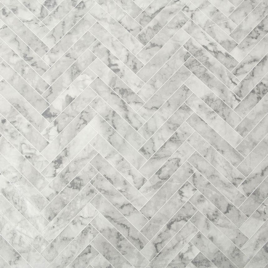 Geometric non-woven wallpaper for bathroom or kitchen, with vinyl surface, grey marble.