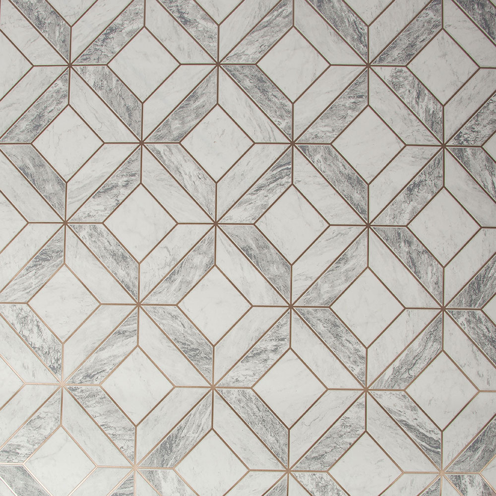 Light gray non-woven wallpaper with metallic lines and a distinctive embossed geometric pattern.