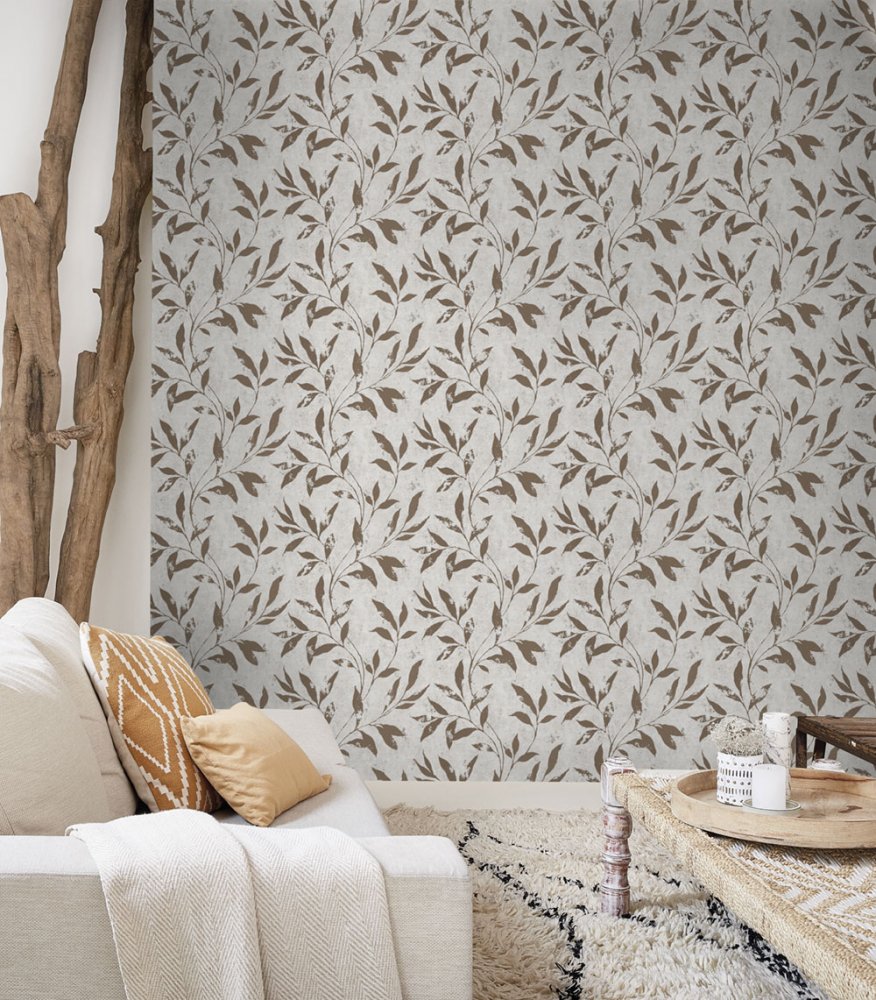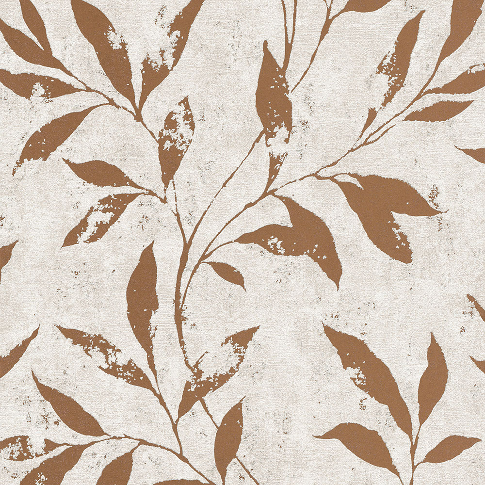 Non-woven wallpaper with a distinctive embossed pattern of copper leaves on a white background.
