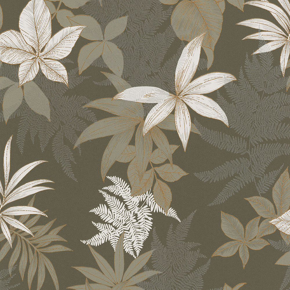 Olive green non-woven wallpaper with silver fern leaves and copper leaf outlines.