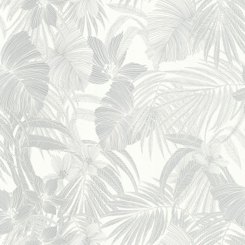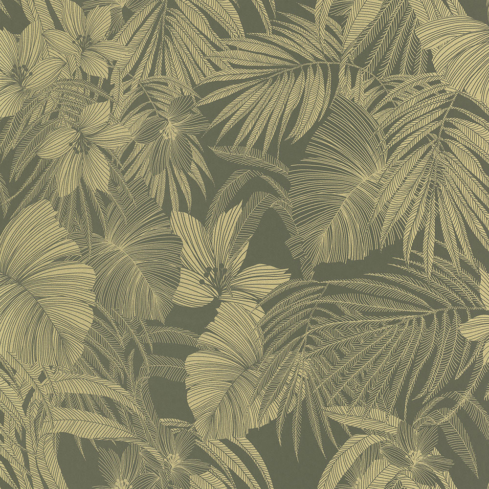 Green non-woven wallpaper with golden palm leaves and delicate outlines of hibiscus flowers.