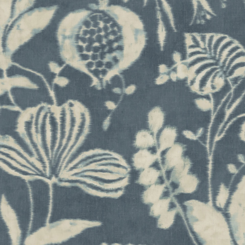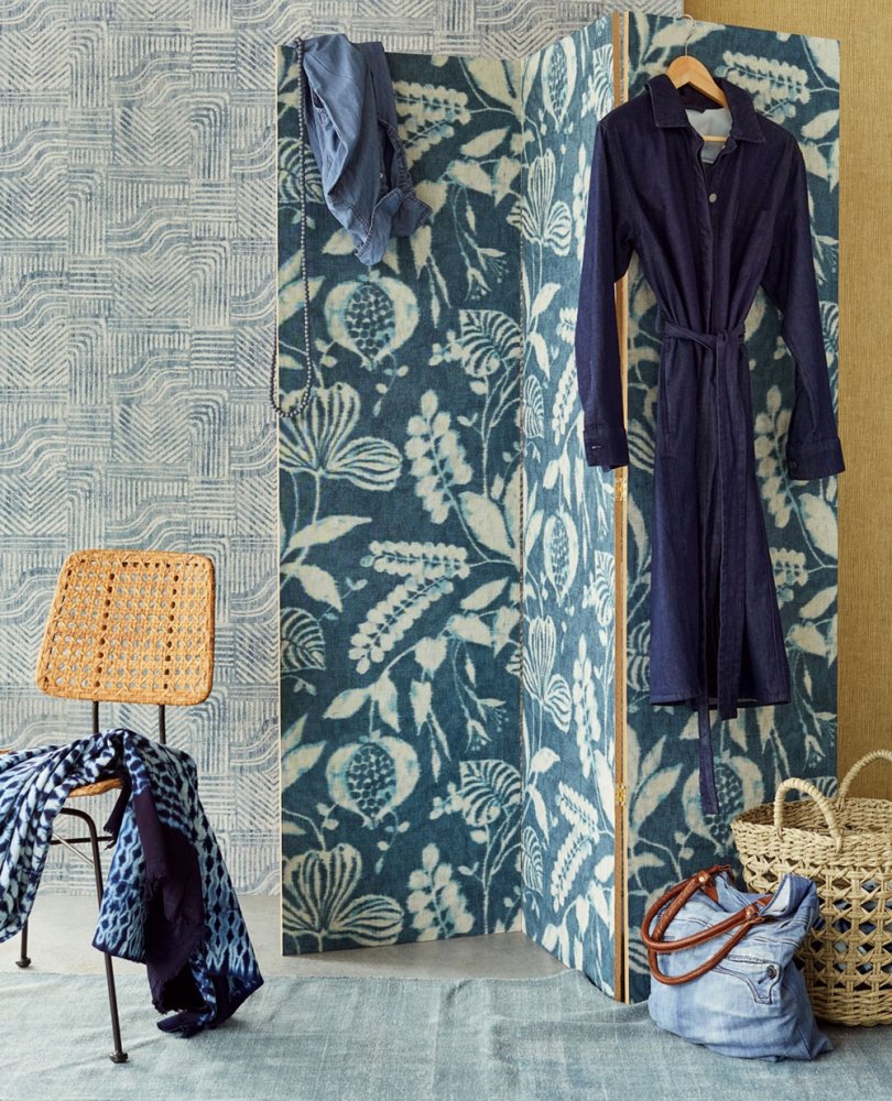 Non-woven wallpaper with a vinyl surface - finely structured coarsely woven fabric design with a botanical batik effect in soft blue tones, natural gray-beige pattern.