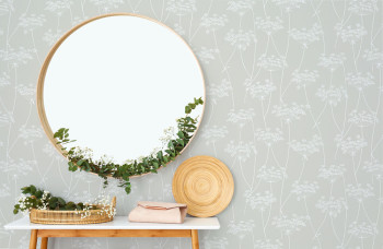 Natural and plant motifs will make every interior pleasant and cozy. Light green non-woven wallpaper with a white floral motif.
