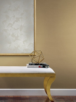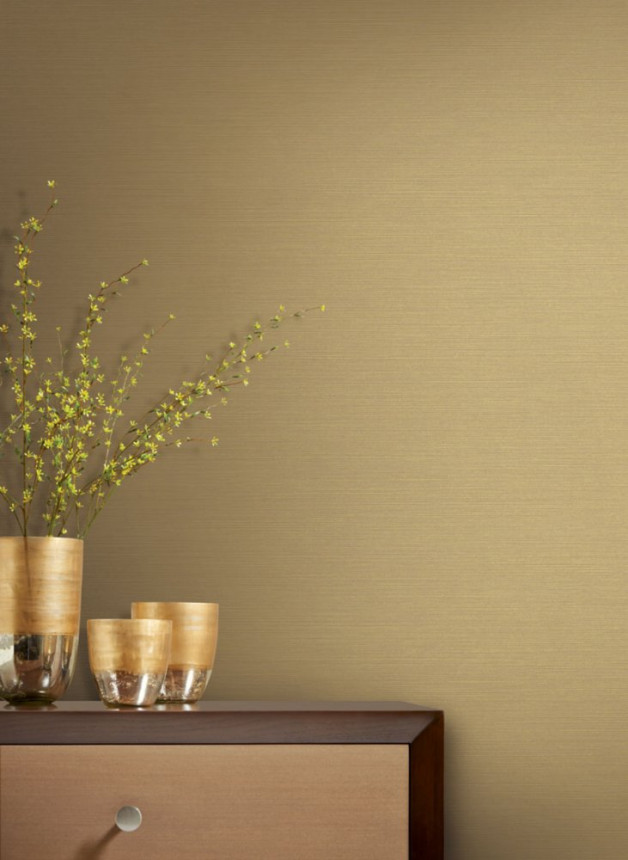 Finely embossed metallic gold non-woven wallpaper, imitation of coarser fabric.