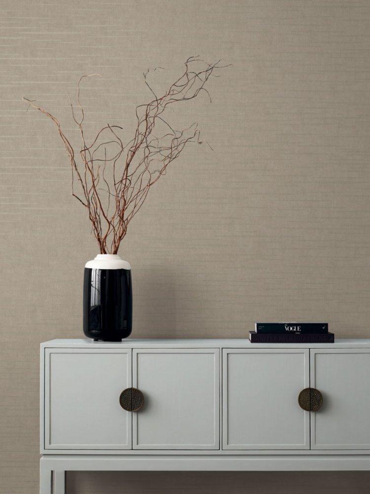 Brown-grey non-woven wallpaper, metallic shiny gold horizontal stripes.