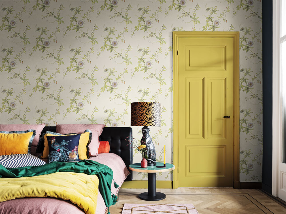 Non-woven wallpaper with a vinyl surface and a motif of plants and flowers on a yellow background.