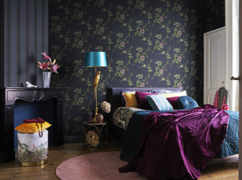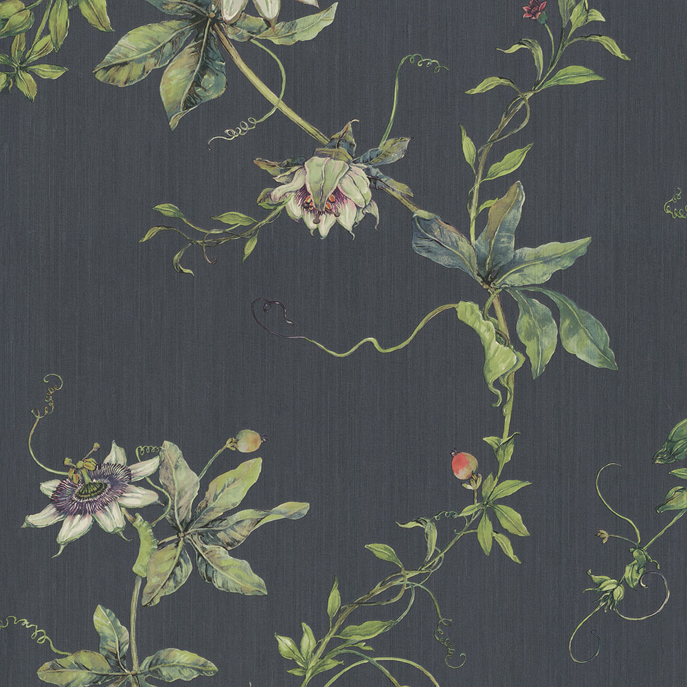 Non-woven wallpaper with a vinyl surface and a motif of plants and flowers on a dark blue background.