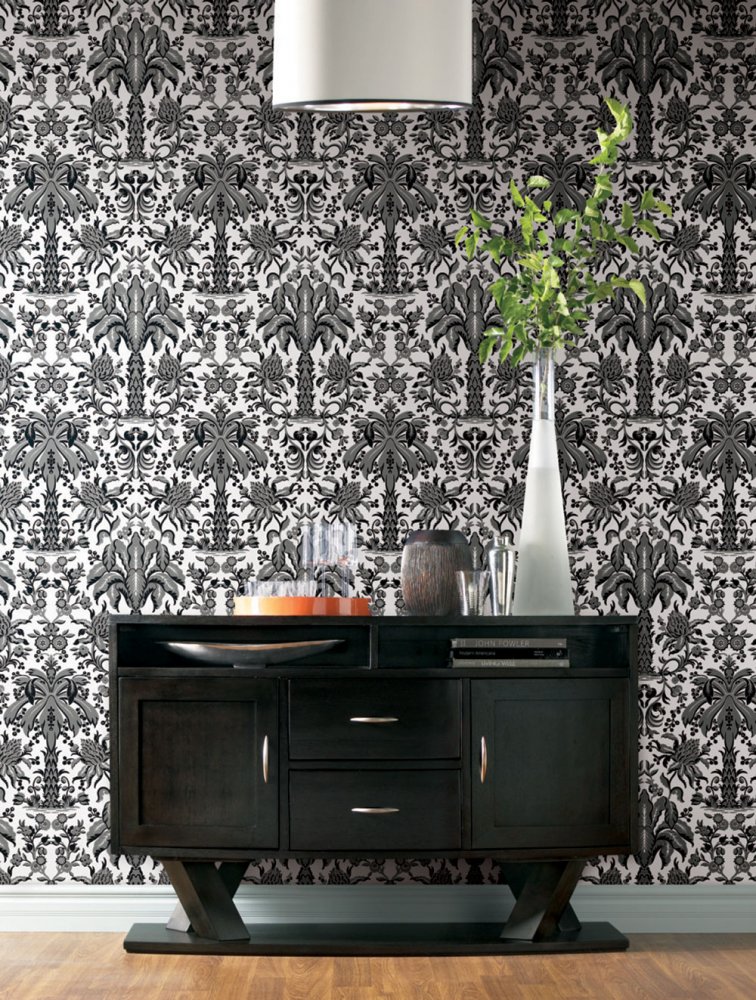 Grey-black-white paper wallpaper, coarse fabric texture, ornamental floral patterns and palm trees. Solid thick paper.