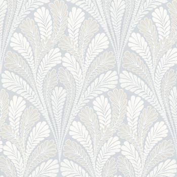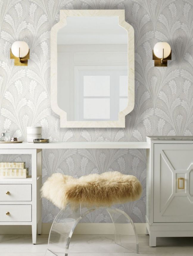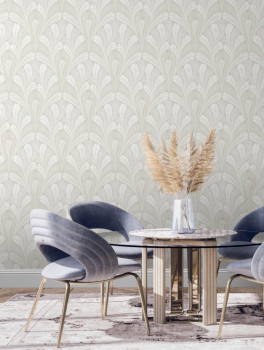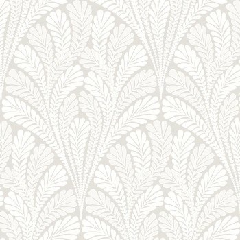Grey smooth pre-pasted wallpaper - grey-beige and white stylized leaves form an ornamental pattern.