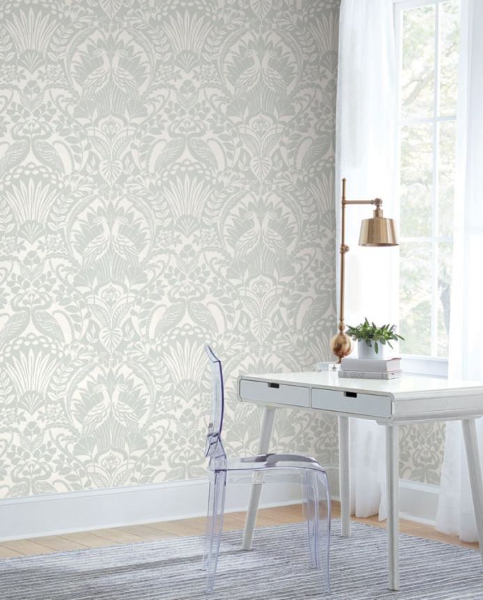 Green-white smooth pre-pasted wallpaper, leaves, birds, ornamental baroque pattern.
