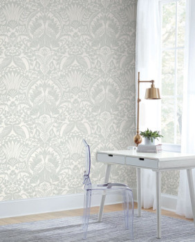 Green- white pre-pasted wallpaper, leaves, birds DM4998, Damask, York