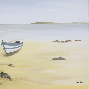 This painting will bring a calming atmosphere to the interior. Printed on canvas. Beach and boat motif.