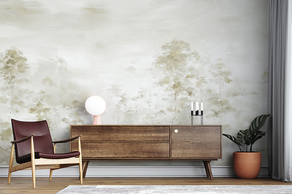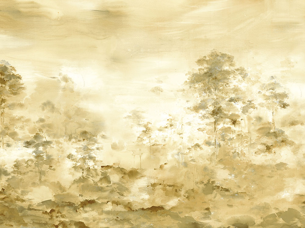 Non-woven 5-part panel with motif of abstract trees in fog in beige shades.