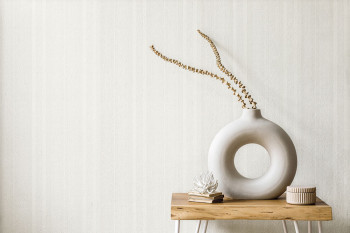 Non-woven wallpaper with a vinyl surface in beige shades with fine stripes.