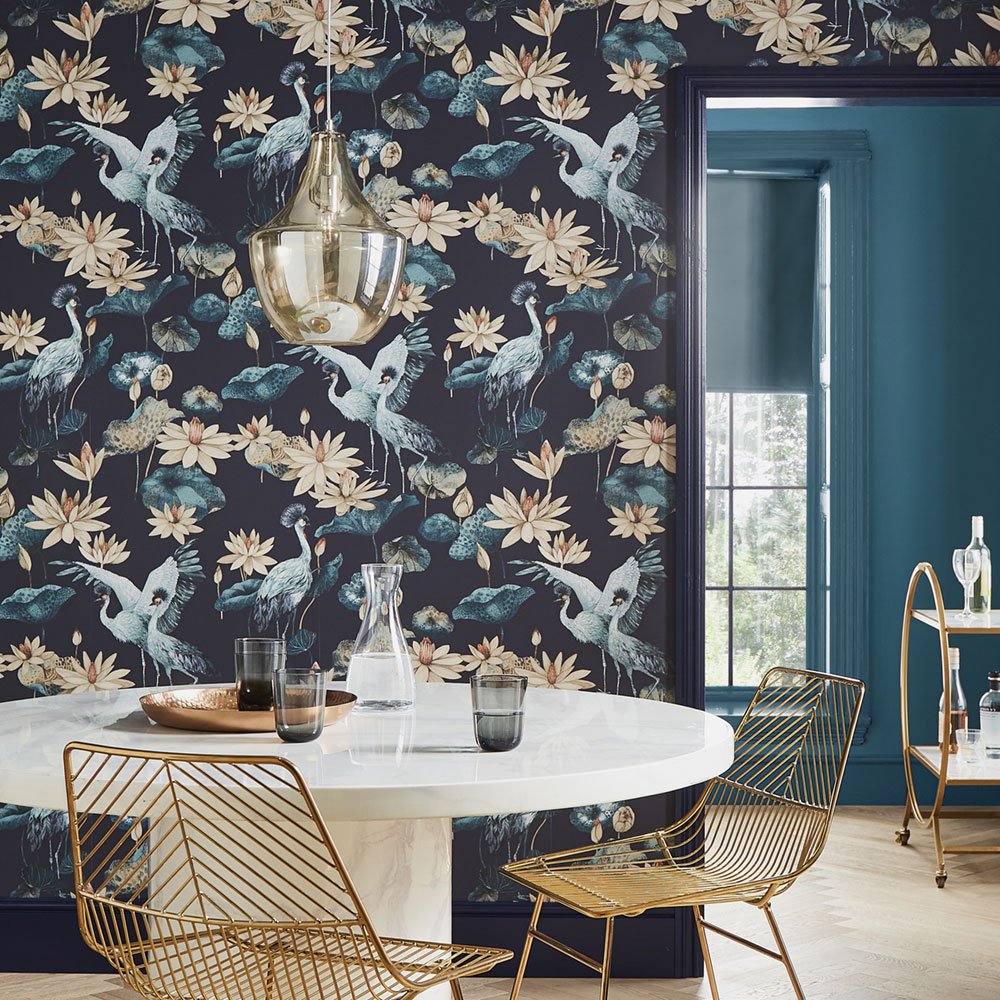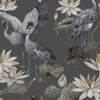 Luxury non-woven wallpaper with lotus and waterfowl motif in turquoise and beige on black background.