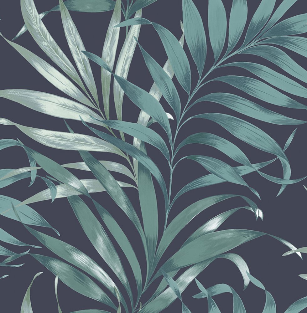 Non-woven wallpaper with a motif of green palm leaves on a black background will create a pleasant atmosphere in the interior.