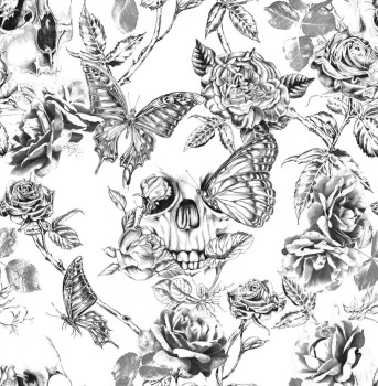 Non-woven wallpaper in gray with the motif of flowers, butterflies and skulls painted with pencil on a white background.