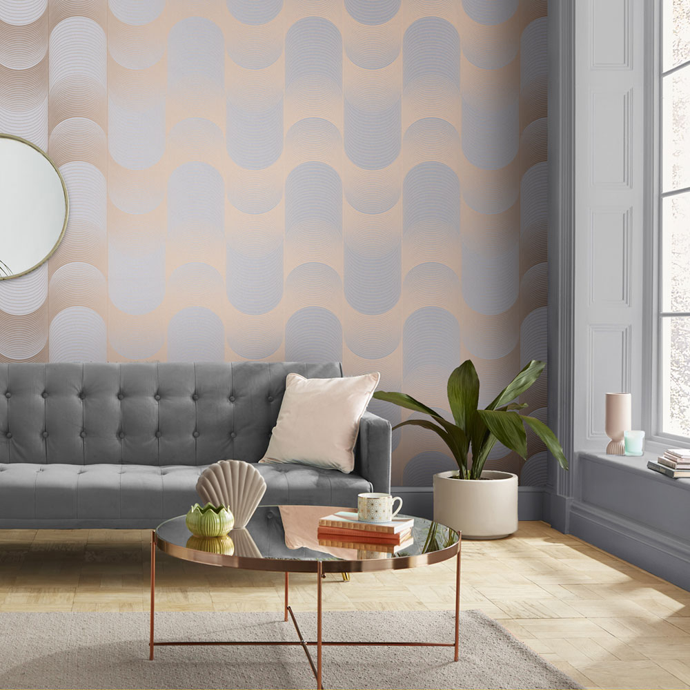 Non-woven wallpaper with copper waves on a light gray background will bring luxury and nobility to the interior.