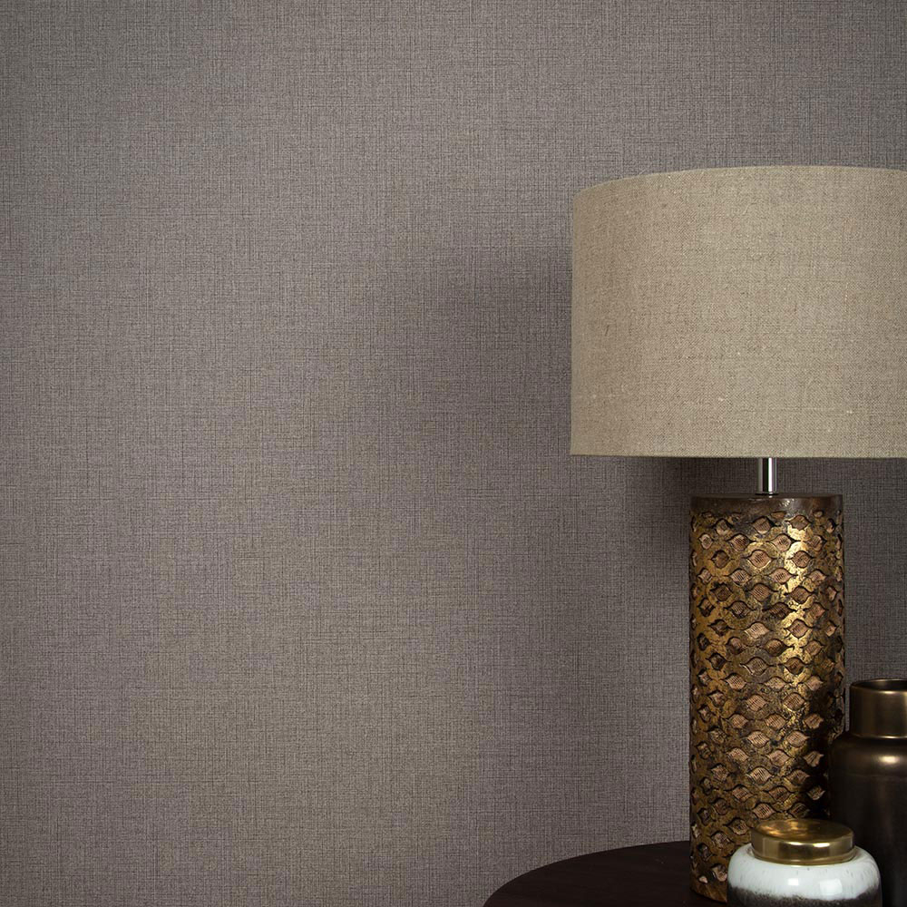 Brown non-woven wallpaper with a vinyl surface and a fine textile structure.