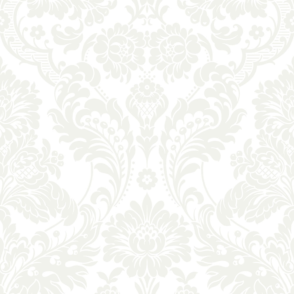 Luxury white non-woven wallpaper with flock ornaments.