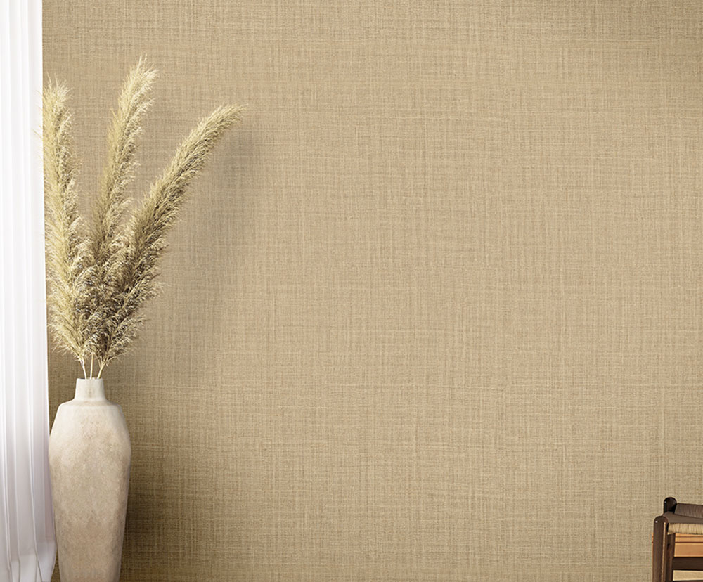 Luxury non-woven wallpaper with a vinyl surface with a distinctive coarse structure in beige color with metallic reflections.