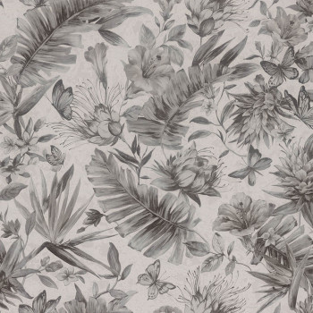Luxury floral non-woven wallpaper with a vinyl surface in bright colors with metallic reflections. Motif of tropical flowers and butterflies. Coarse texture.