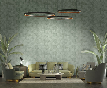Luxury non-woven wallpaper with a vinyl surface in green color with metallic reflections, a coarse structure and a geometric pattern of hexagons.