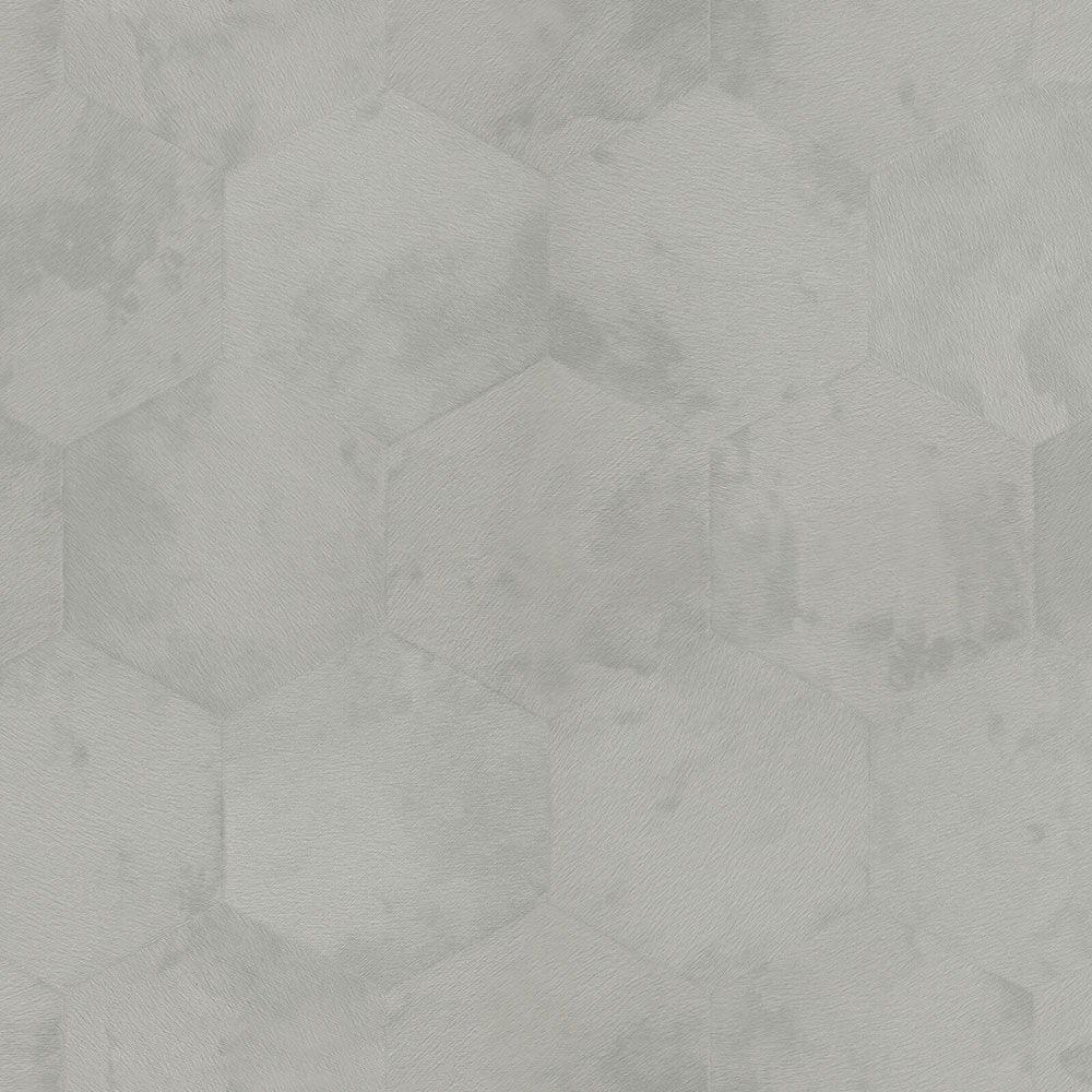 Luxury non-woven wallpaper with a vinyl surface in light gray color with a coarse structure and a geometric pattern of hexagons.