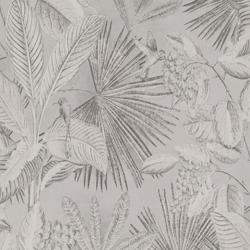 Grey non-woven wallpaper, leaves and birds motif, fabric texture.
