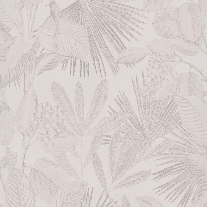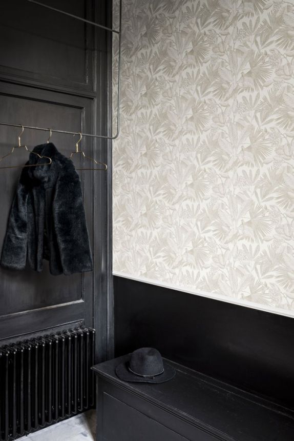 Cream non-woven wallpaper, leaves and birds motif, fabric texture.