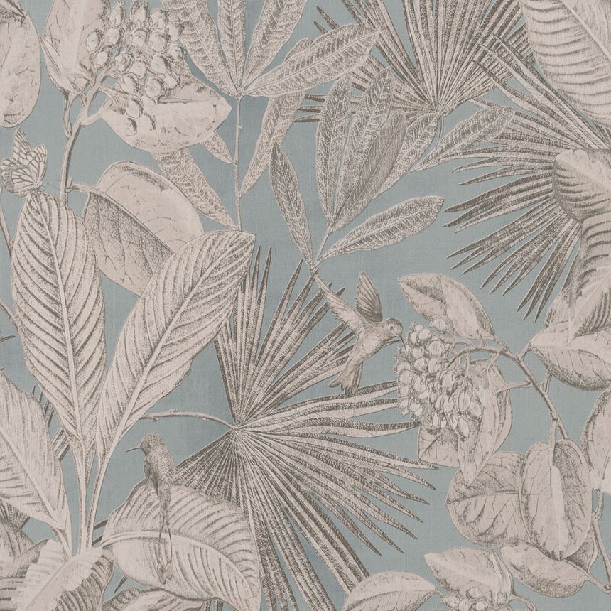Blue-grey non-woven wallpaper, leaves and birds motif, fabric texture.