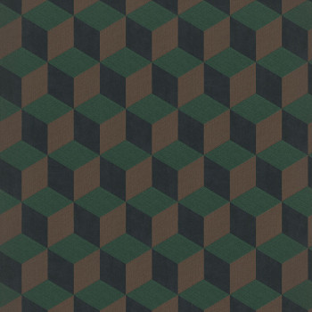 Geometric non-woven wallpaper with 3D effect, cubes in shades of green, black and brown, fabric texture.