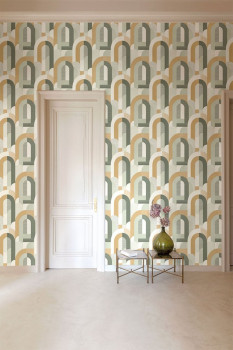 Graphic non-woven wallpaper, Art Deco style, shades of green, beige and cream. The wallpaper has a fine grit texture.