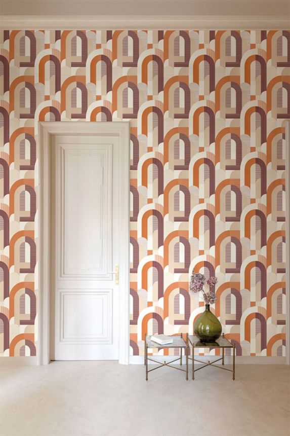 Graphic non-woven wallpaper, Art Deco style, shades of cream, beige, burgundy and terracotta. The wallpaper has a fine grit texture.