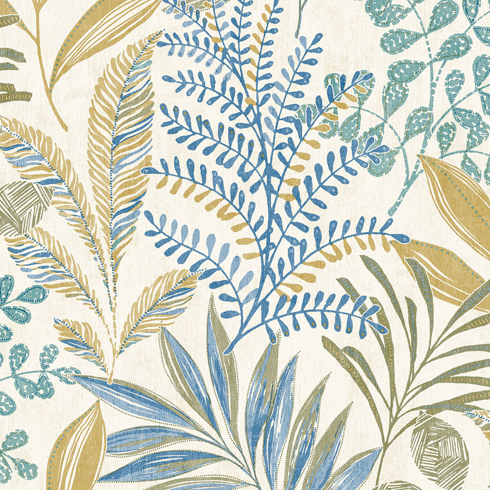 Non-woven wallpaper, leaves in shades of blue, ocher and turquoise on a cream background.