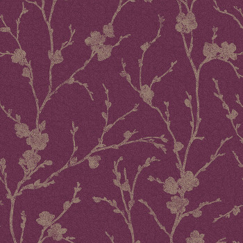 Non-woven wallpaper with a high-quality paper surface - matt burgundy background, metallic beige cherry blossom branches.