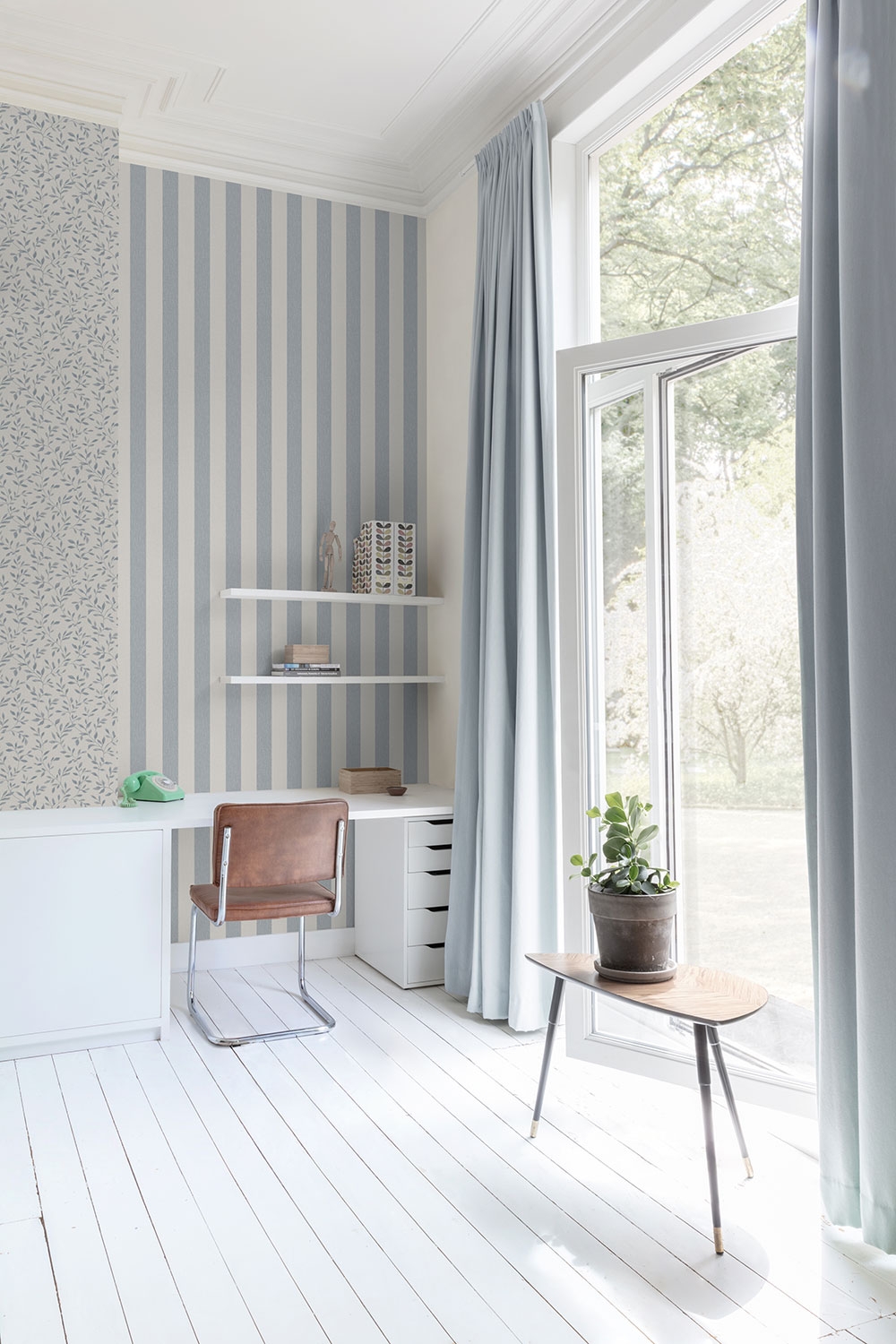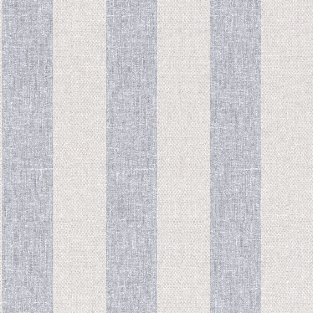 Stripes in shades of gray and blue on non-woven wallpaper with a subtle textile texture. We recommend pairing this with related patterns.
