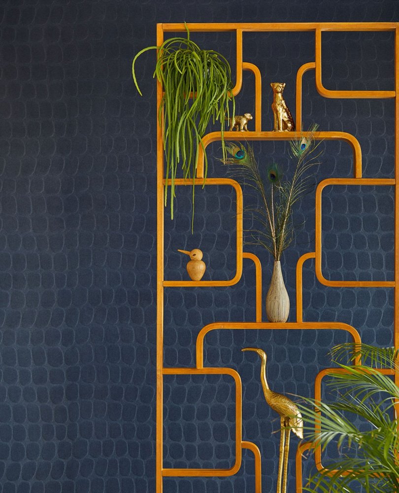Design inspired by a crocodile skin pattern - luxurious embossed texture of a velvety soft flock in shades of dark blue - colors change according to light incidence.