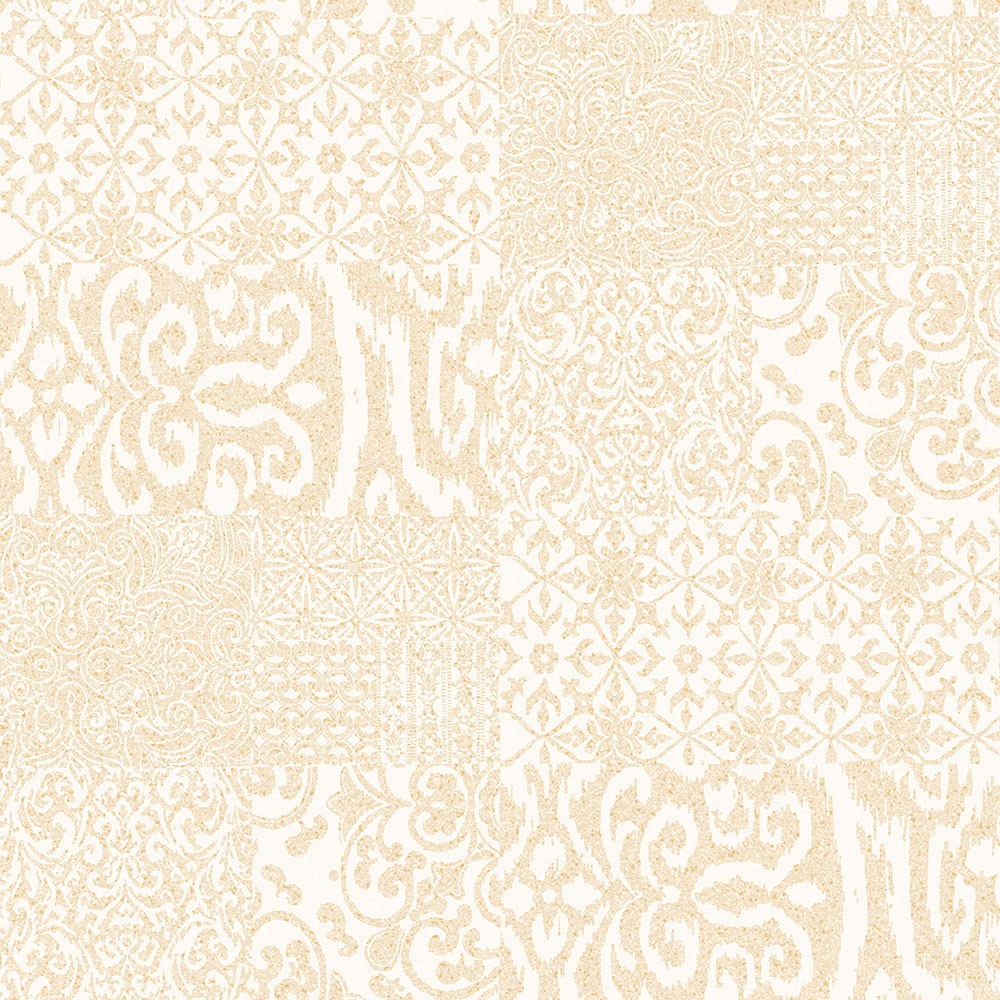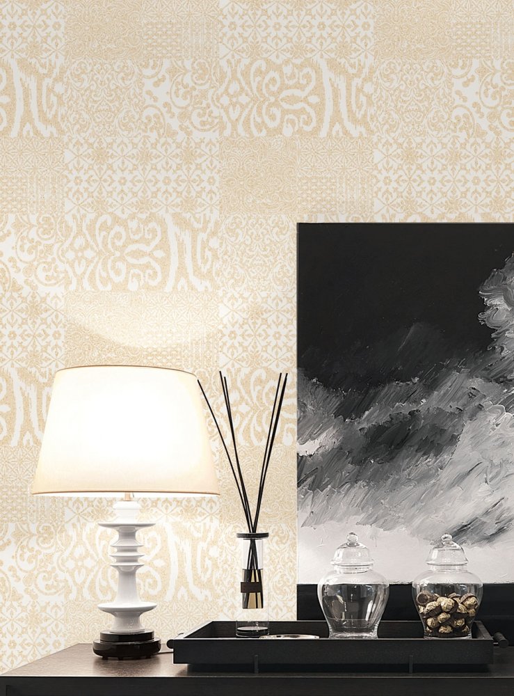 Non-woven wallpaper. Metallic pearl background, embossed metallic beige-gold pattern.