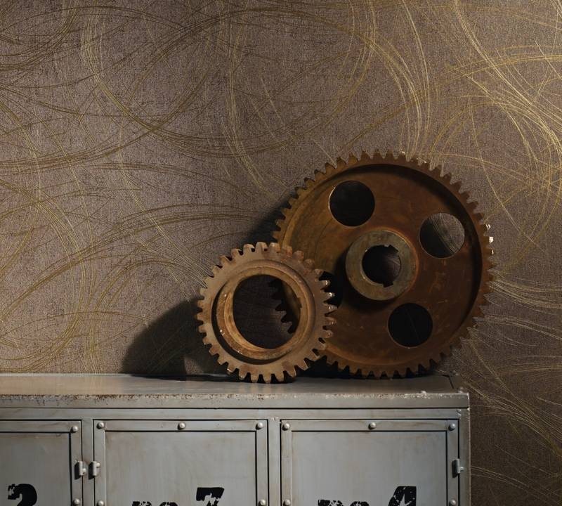 Scratched bronze-gold pattern on a brown non-woven wallpaper.