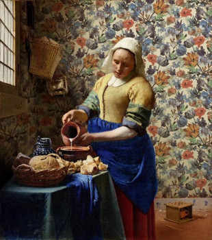 Like the old masters canvases. Colorful floral pattern - tulips, irises, daffodils on a beige background.